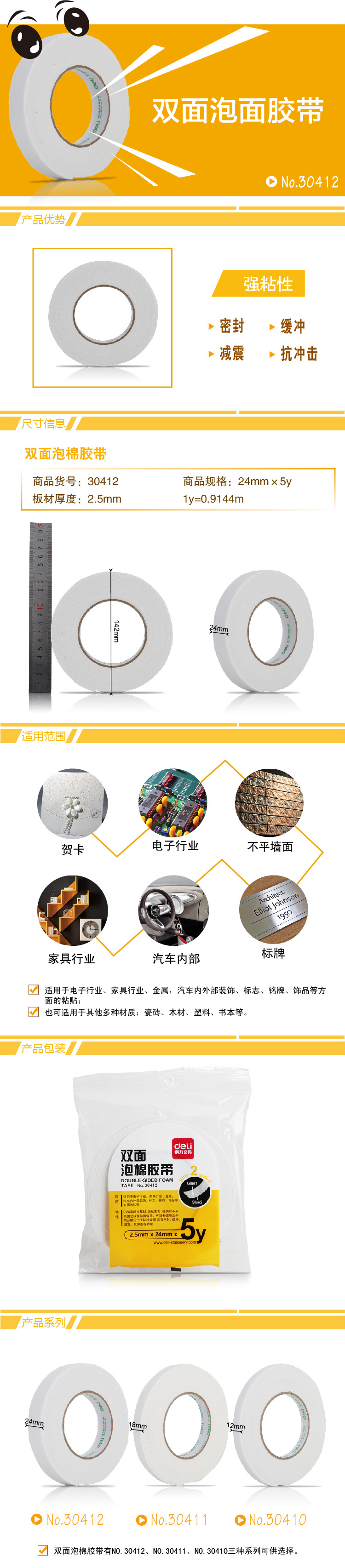 得力 30412EVA 泡棉雙面膠帶 24mm*5y*2.5mm 白色