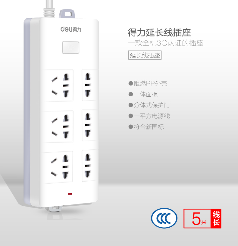 得力 18257 單控六聯(lián)接線板插座 5米