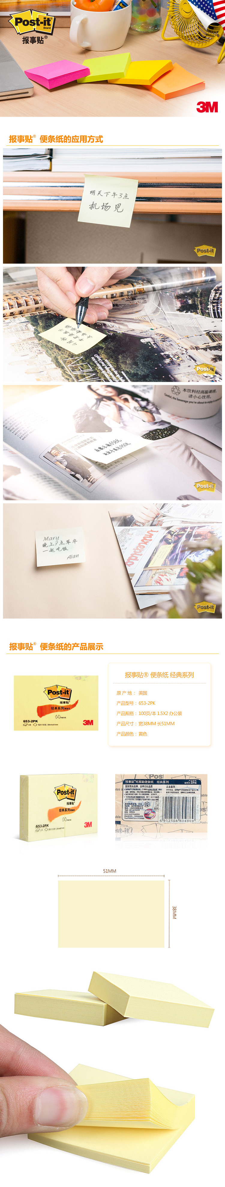 3M 653-2PK 報事貼便條紙 38*51mm 黃色
