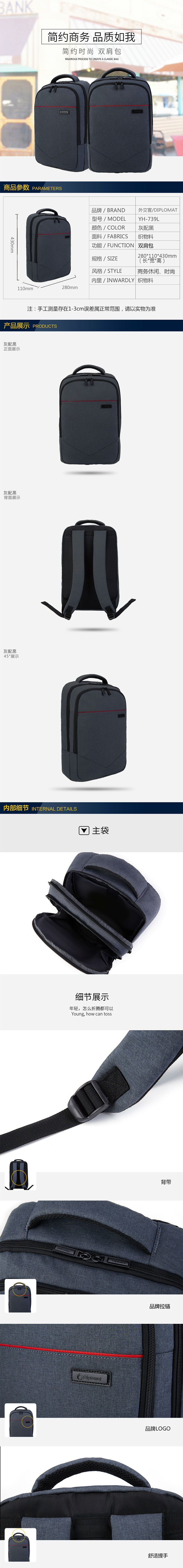 外交官 YH-739L 商務(wù)休閑雙肩背包 灰黑