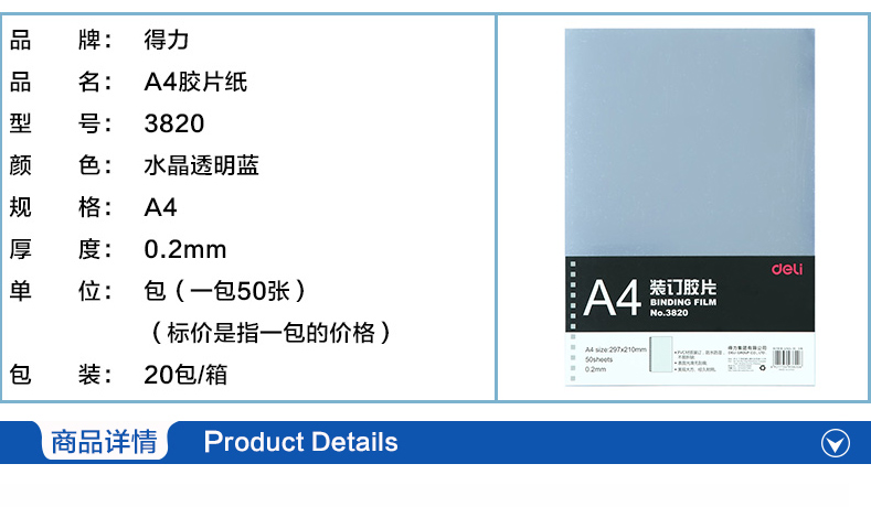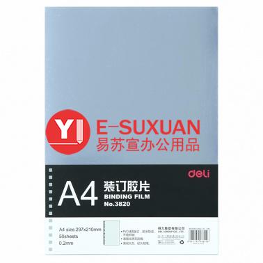 得力 3820 PVC裝訂膠片 A4 0.2mm 透明 50張/包