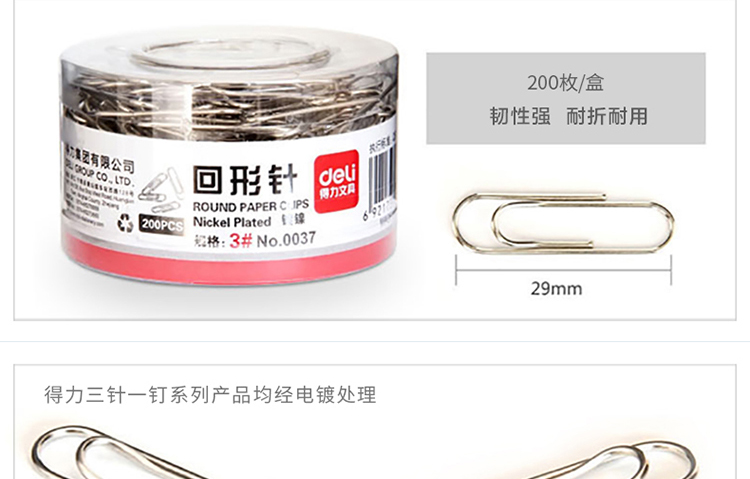 得力 0037 加厚電鍍表層回形針 30mm 200枚/筒