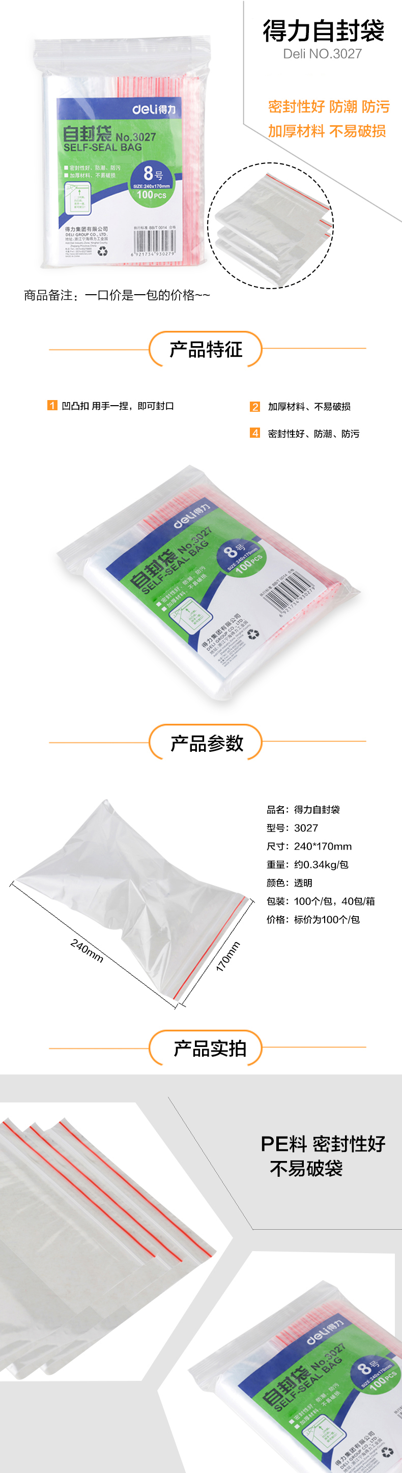得力 3027 自封袋8號(hào) 240x170*0.04mm 透明 100個(gè)/包