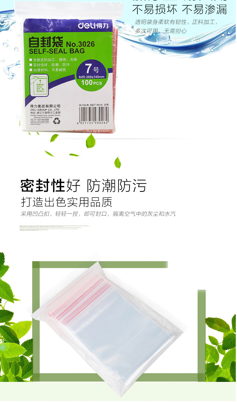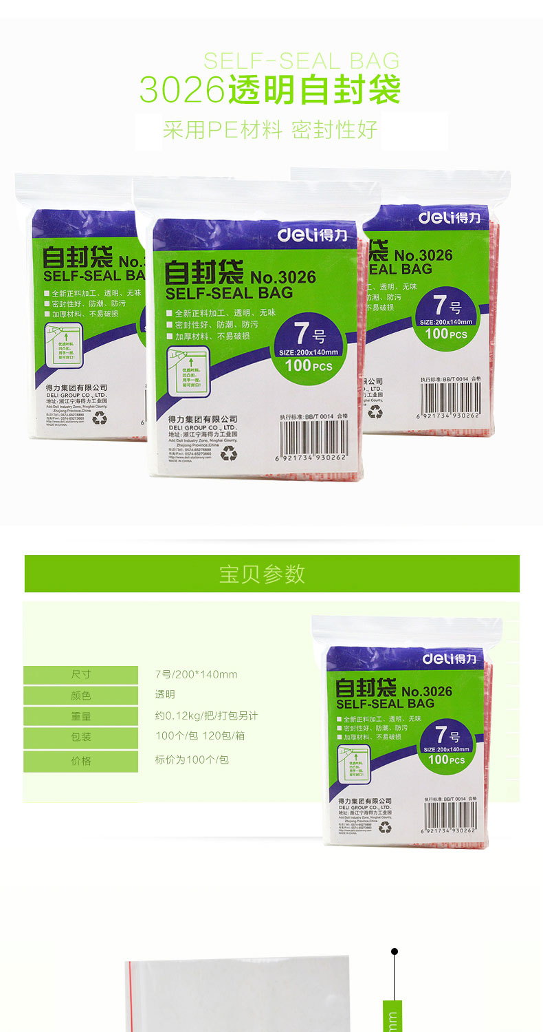 得力 3026 自封袋7號 200x140*0.04mm 透明 100個/包