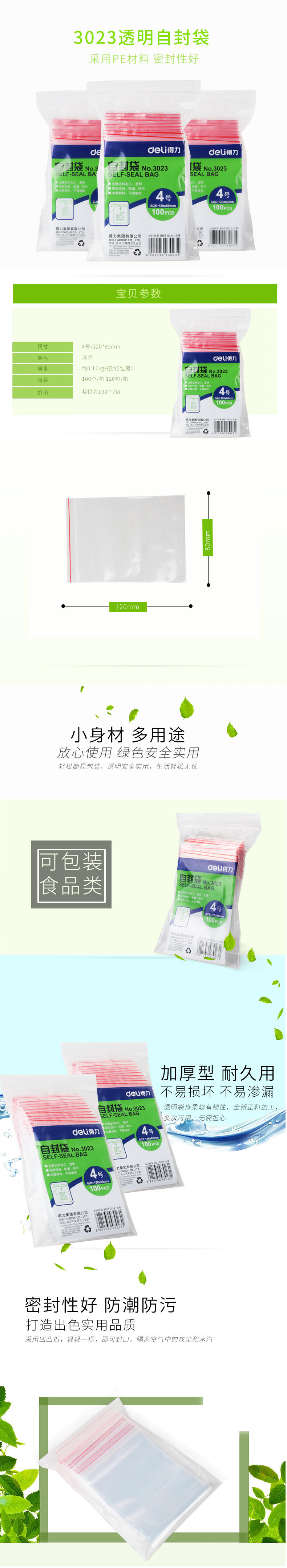 得力 3023 自封袋 4號 透明 100個/包 120*80mm*0.04mm