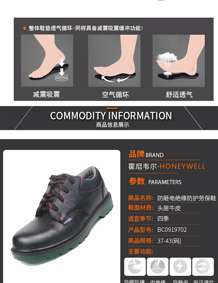 霍尼韋爾 BC0919702 ECO 防砸/電絕緣低邦安全鞋 黑色 45碼