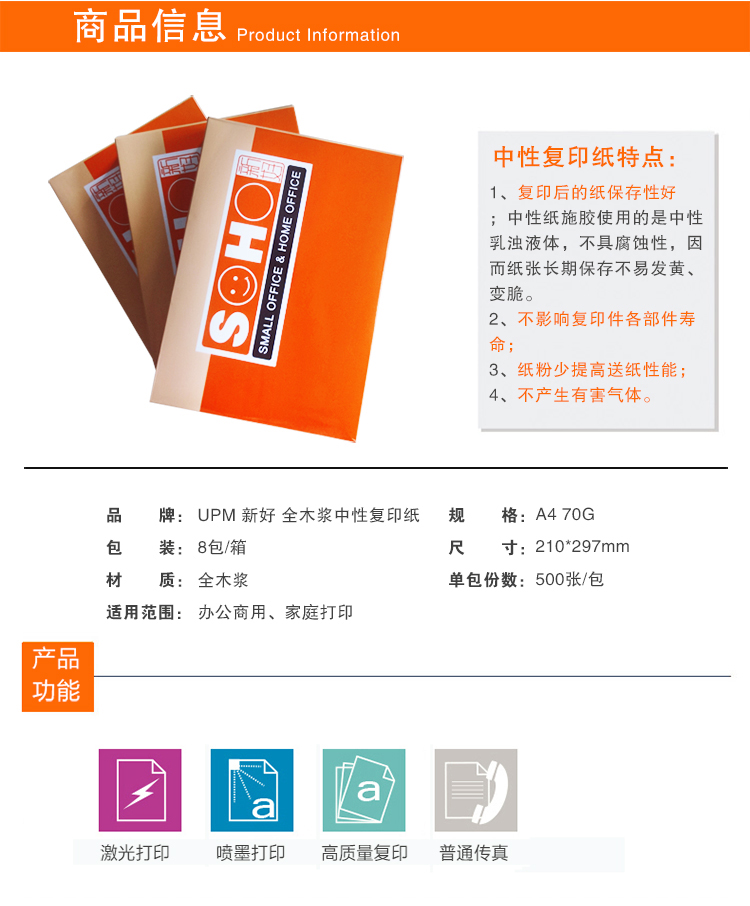 UPM橙新好(SOHO) 70g 復印紙 A4 白色 500張/包 5包/箱