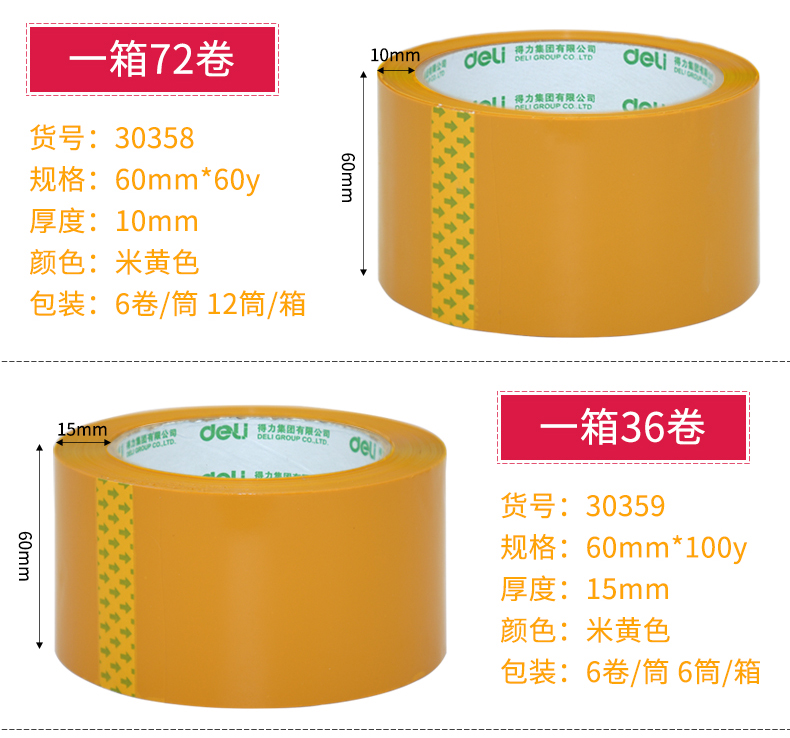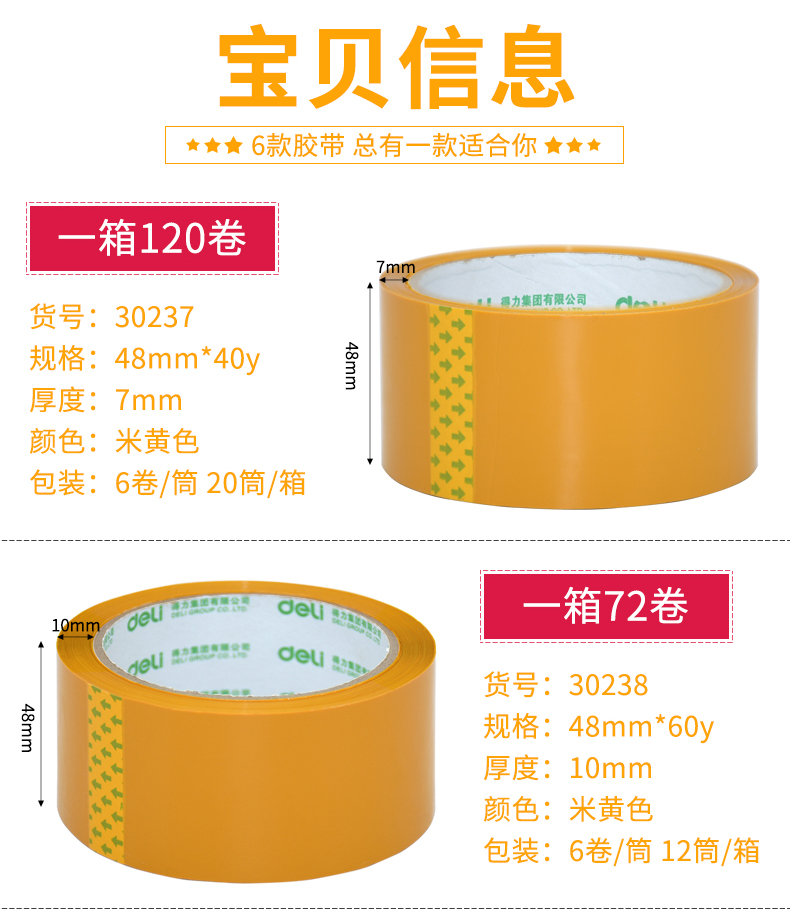 得力 30237 封箱膠帶 48mm*40y 米黃色 6卷/筒