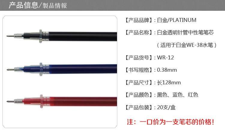 白金 WR-12 中性筆芯 0.38mm 黑色 20支/盒