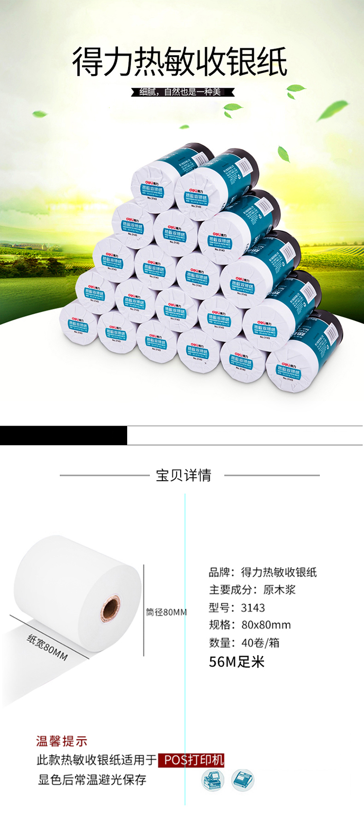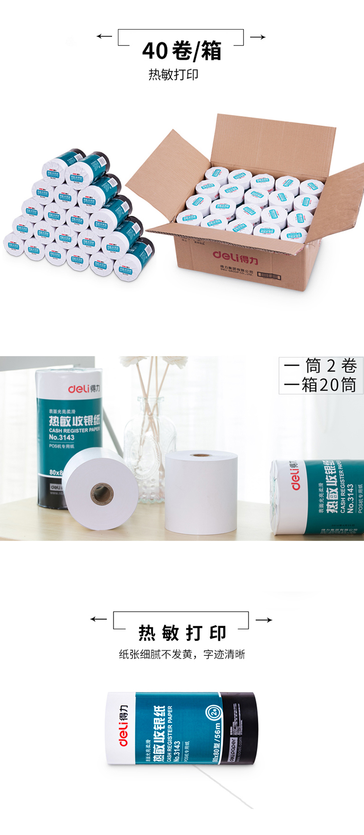 得力 3143 熱敏收銀紙 80mm*80mm 白色 2卷/筒