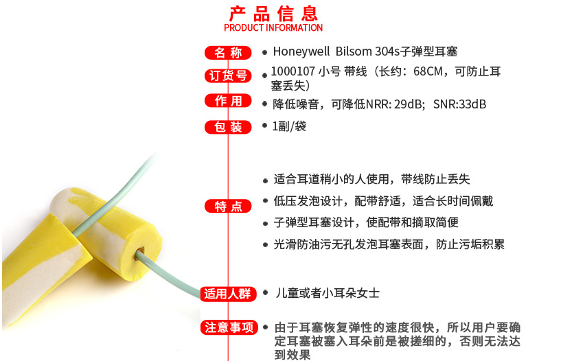 霍尼韋爾 Bilsom 304子彈型帶線耳塞 100副/盒 1000107