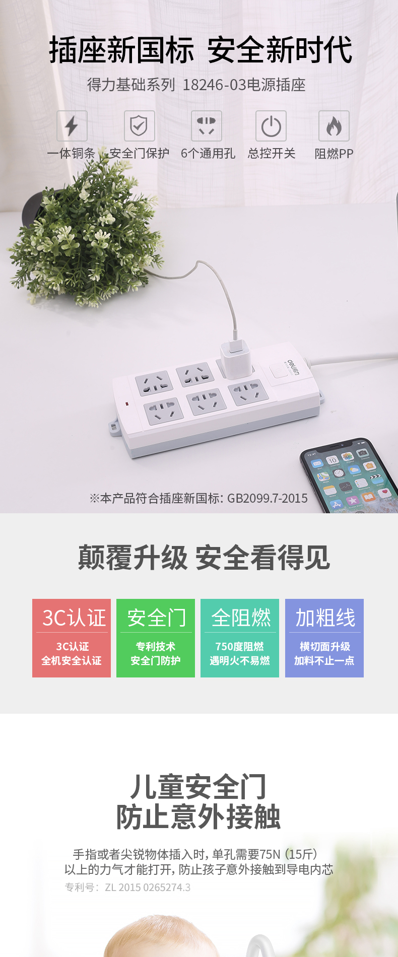 得力18246-03 單控六聯(lián)拖線板插座 3米 白色