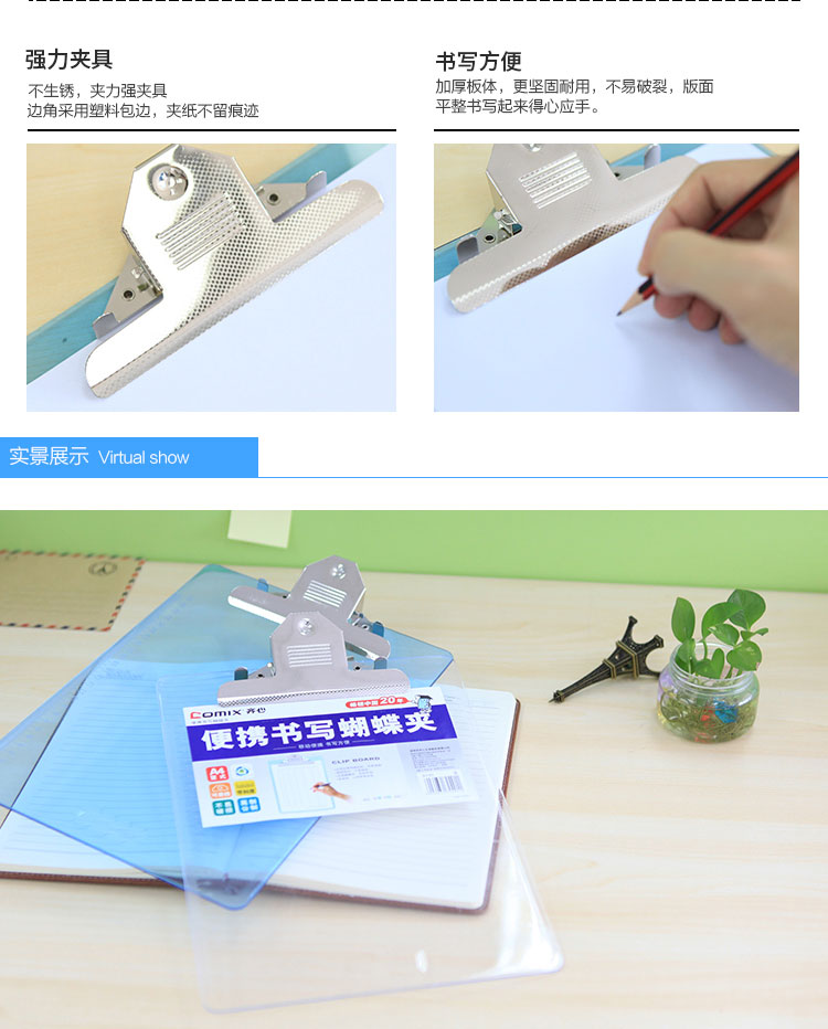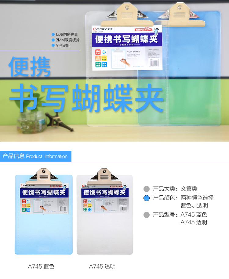 齊心(Comix) A745 便攜式書寫蝴蝶夾/板夾 A4