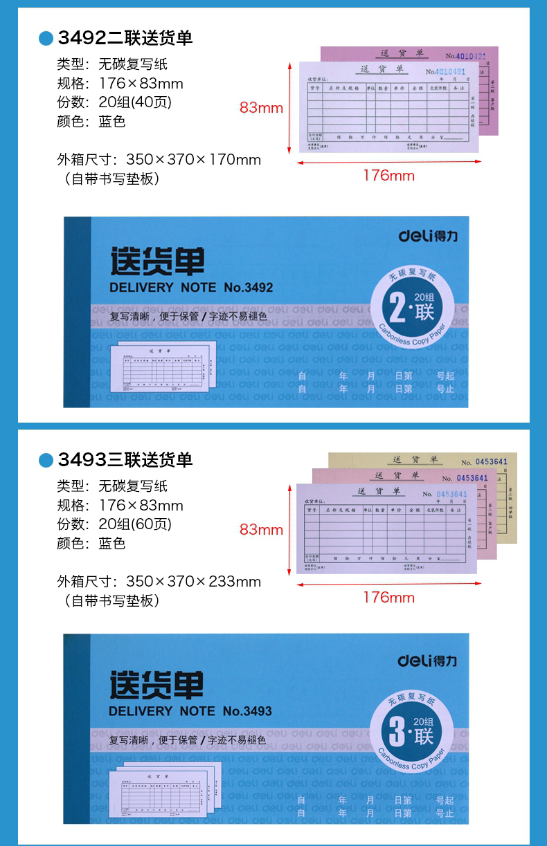 得力(Deli) 3493 三聯(lián)無碳復(fù)寫送貨單 20組/本 藍(lán)色