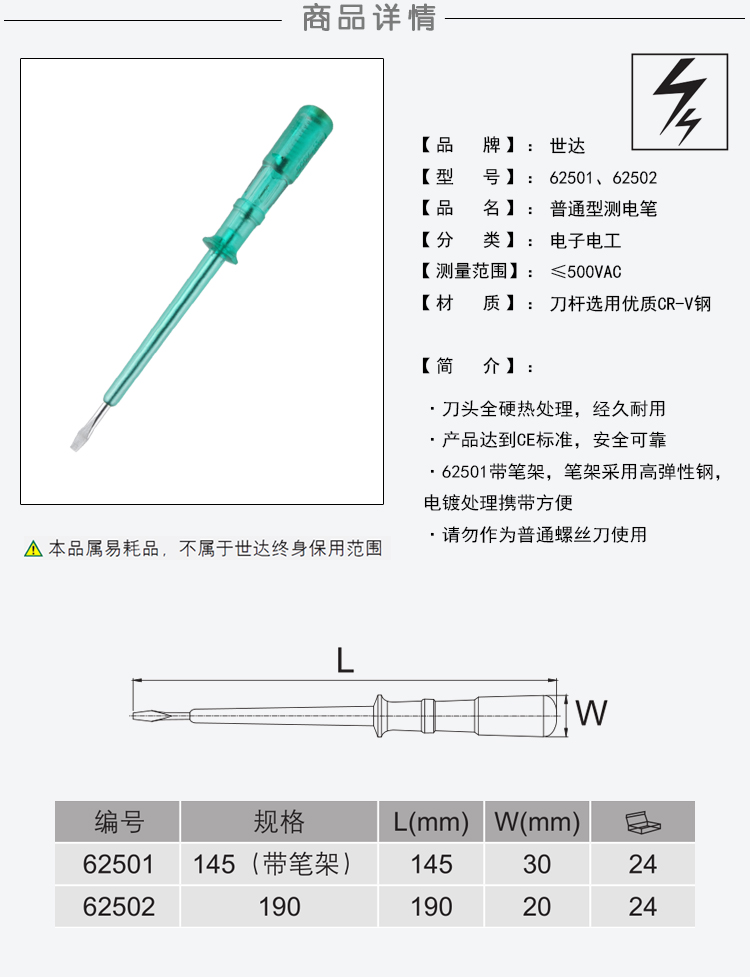 世達 62502 普通型測電筆 190MM