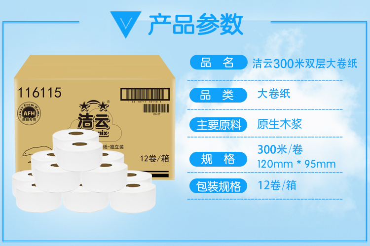 潔云 116115 雙層大卷紙 300米 12卷/箱 按箱銷(xiāo)售