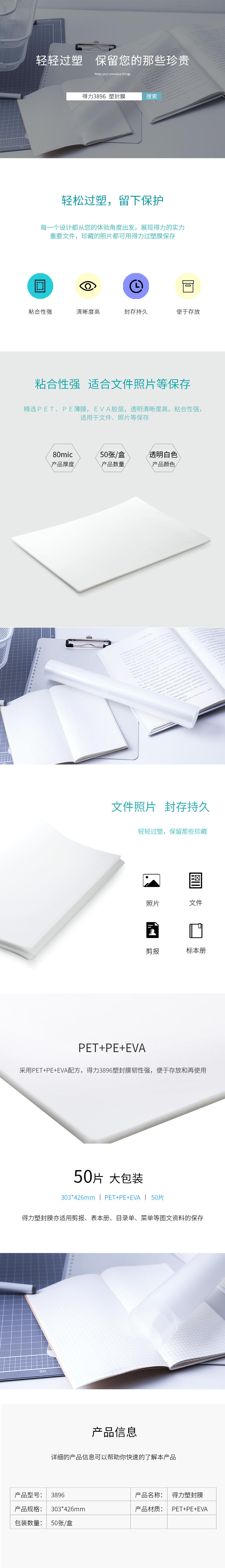 得力 3896 塑封膜 A3 透明 50張/盒 80mic