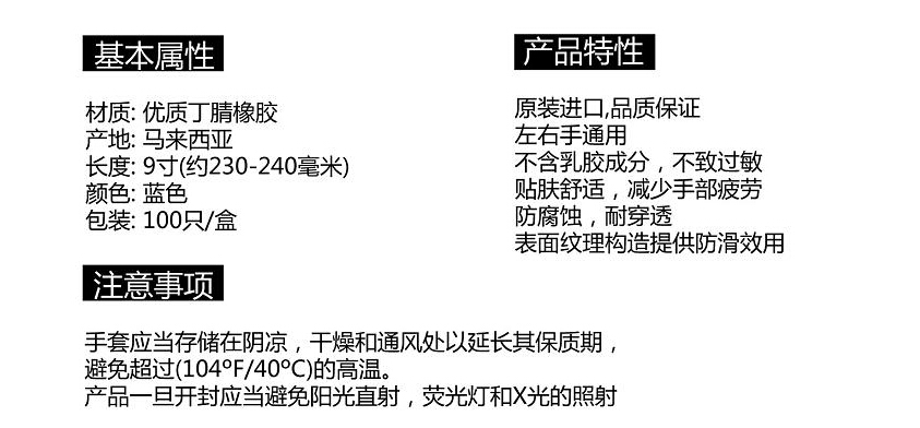 不含乳膠,不易過敏,AQL=2.5 嚴(yán)格質(zhì)量控制體系,安全可靠,0.08mm超薄厚度,舒適靈敏,SFDA食品藥品安全認(rèn)證,防腐蝕,耐穿透 采用超薄技術(shù)精制而成,“微糙面”提供良好的靈巧性和極好的干濕防滑抓握力 結(jié)實(shí)耐用,使用壽命長(zhǎng) 50副/盒,10盒/箱 倉(cāng)儲(chǔ)條件: 手套應(yīng)當(dāng)存儲(chǔ)在陰涼,干燥和通風(fēng)處以延長(zhǎng)其保質(zhì)期。避免超過(140oF/60oC)的高溫。產(chǎn)品一旦開封應(yīng)當(dāng)避免陽光直射,熒光燈和X光的照射